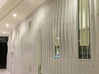 Application d'un décor imaginé par un architecte et réalisé par IP Sign. Bandes d'acier de 4mm d'épaisseur et de plus de 4m de hauteur traitées et peintes. Posés en intérieur.
